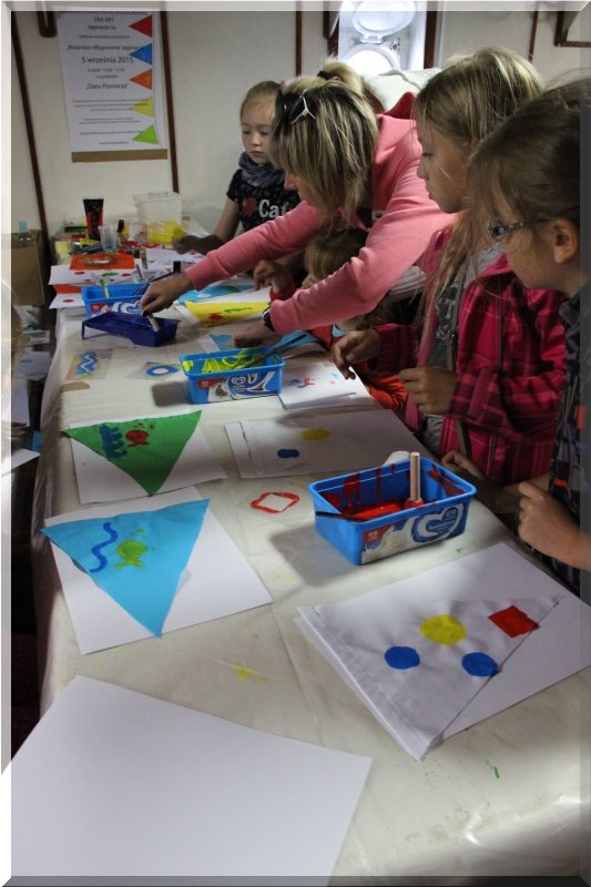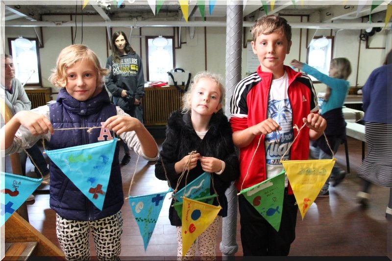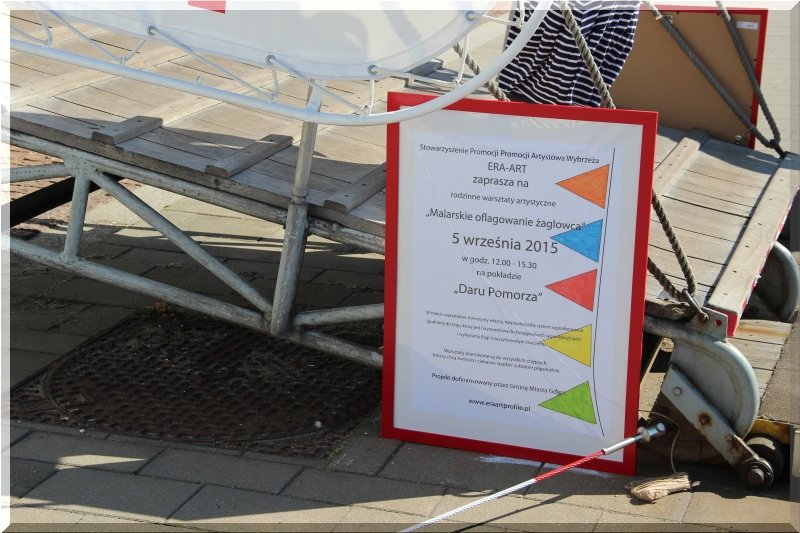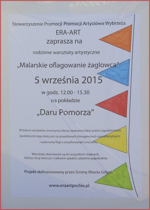 Stowarzyszenie Promocji Artystów Wybrzeża ERA-ART zapraszało na rodzinne warsztaty artystyczne „Malarskie oflagowanie żaglowca” dnia 5 września w godz. 12-15.30 na pokład „Daru Pomorza”. W trakcie warsztatów stworzyliśmy własny niepowtarzalny systemem sygnalizowania (podobny do tego, który jest na prawdziwych chorągiewkach sygnalizacyjnych) i wykonaliśmy flagi o zaszyfrowanym znaczeniu. Warsztaty skierowane były do wszystkich chętnych którzy chcą twórczo i ciekawie spędzić sobotnie popołudnie.